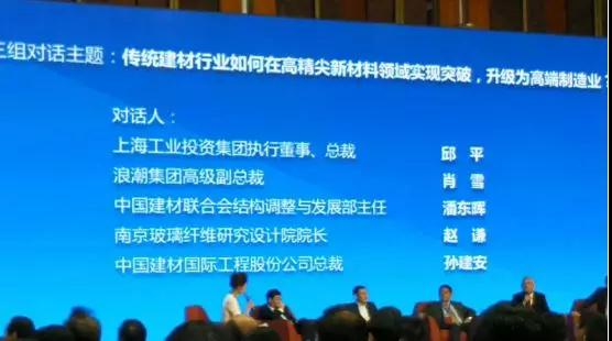 上海工業投資(集團)有限公司執行董事、總裁邱平,浪潮集團高級副總裁、中國檢驗檢測學會質量鏈工作委員會主任肖雪、中材高新材料股份有限公司總裁張偉儒、南京玻纖院董事長趙謙、蚌埠玻璃工業設計研究院常務副院長馬立云就“傳統建材如何在高精尖新材料領域實現突破,推動建材行業升級為高端制造業”交換了意見。