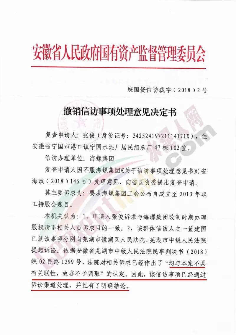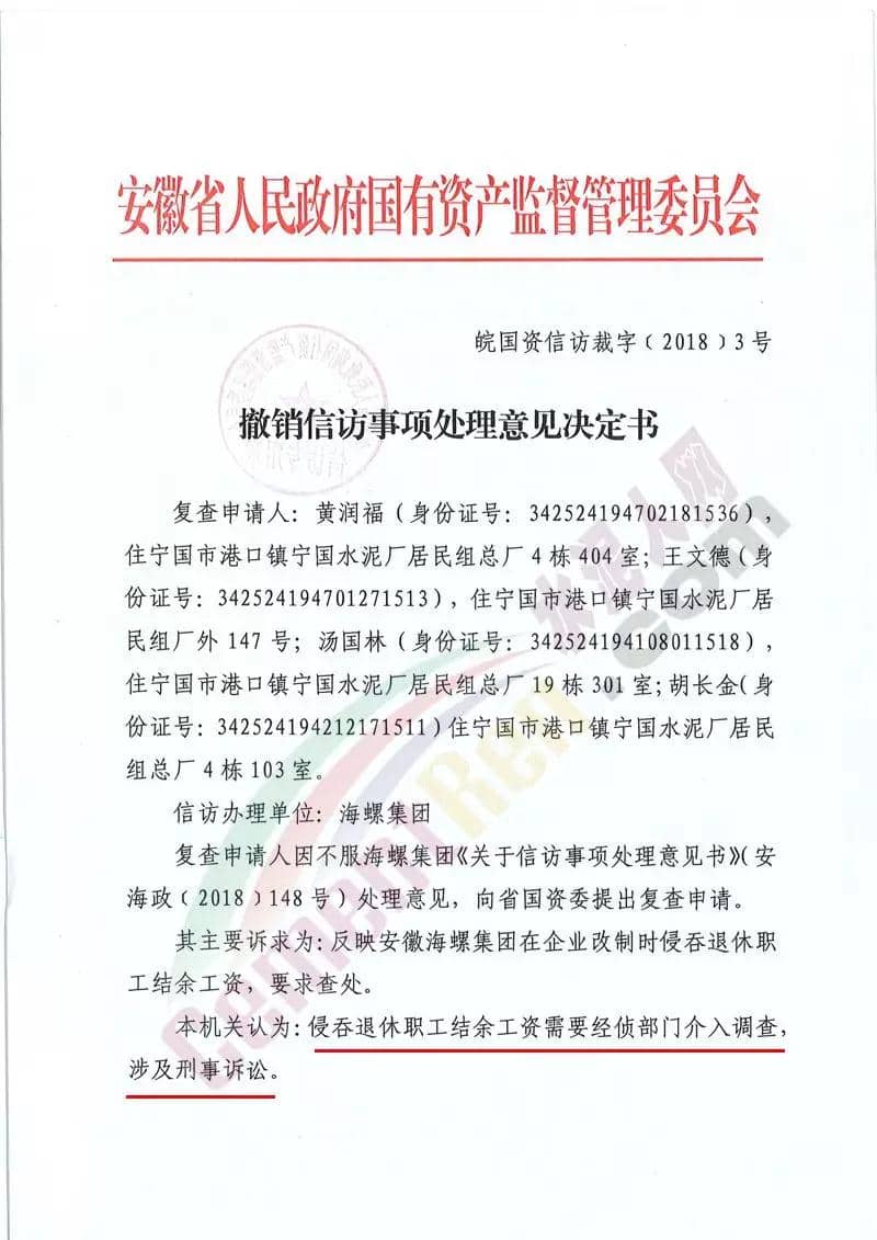 同期,安徽省人民政府國有資產監督管理委員會發布了《撤銷信訪事項處理意見決定書》(皖國資信訪裁字【2018】3號)文件。文件稱,針對相關人員反映海螺集團在企業改制時侵吞退休職工結余工資一事。需要經偵部門介入調查,涉及刑事訴訟。按照國務院《信訪條例》相關條款規定,撤銷海螺集團《關于信訪事項處理意見書》(安海政【2018】148號)處理意見。請海螺集團引導信訪人通過其他法定途徑反映訴求。文件原文如下: