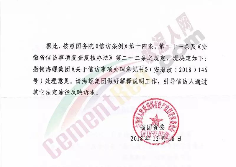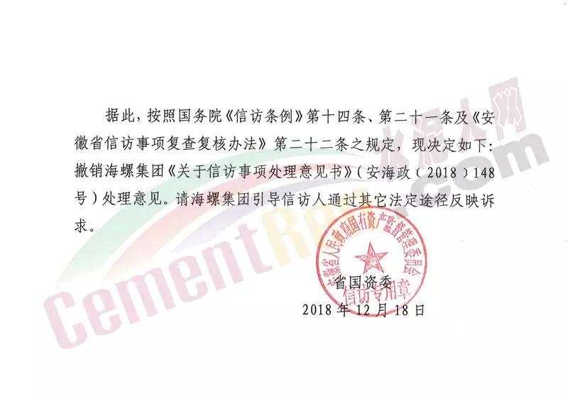 日前,安徽省人民政府國有資產監督管理委員會發布《撤銷信訪事項處理意見決定書》(皖國資信訪裁字【2018】2號)文件。文件稱,信訪事項已經通過訴訟渠道處理,并且有了明確結論。按照國務院《信訪條例》相關條款決定撤銷海螺集團《關于信訪事項處理意見書》(安海政【2018】146號)處理意見。請海螺集團做好解釋說明工作,引導信訪人通過其他法定途徑反映訴求。文件原文如下:
