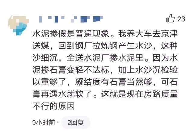 1、有網(wǎng)友說(shuō):水泥摻假是普遍現(xiàn)象。我養(yǎng)大車去京津送煤,回到鋼廠拉煉鋼產(chǎn)生水沙,這種沙細(xì)沉,全送水泥廠摻水泥里。因?yàn)樗鄵绞嘧冚p不達(dá)標(biāo),加上水沙沉檢驗(yàn)以重夠了,凝結(jié)度有石膏當(dāng)然夠,可石膏再遇水就軟了。這就是現(xiàn)在房路質(zhì)量不行的原因。