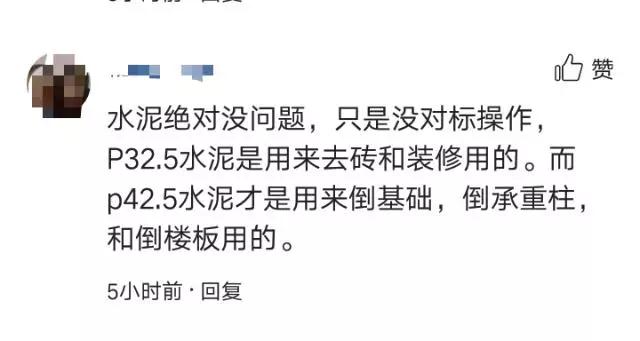 2、還有的網(wǎng)友說(shuō):水泥絕對(duì)沒(méi)問(wèn)題,只是沒(méi)對(duì)標(biāo)操作,P32.5水泥是用來(lái)去磚和裝修用的。而P42.5水泥才是用來(lái)倒基礎(chǔ),倒承重柱,和倒樓板用的。