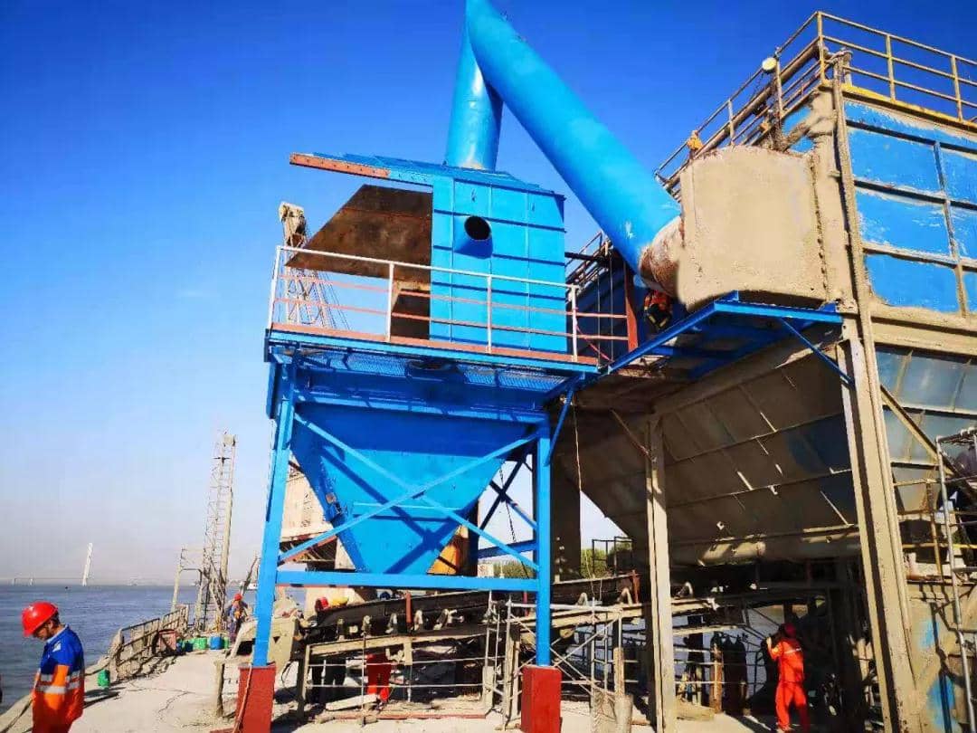 公司水泥原材料熟料、石膏、碎石均從長江船運至自有的散貨碼頭進廠,利用躉船吊機用抓斗從運輸船里抓起散狀物料,提至約10米高處卸到特定料斗,料斗下面為帶式輸送機。此作業(yè)方式物料落差大,加上未設計安裝收塵設備,吊料時造成的揚塵很大。