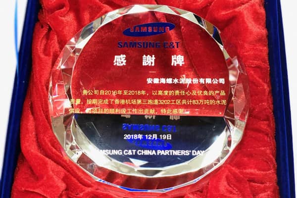 2018年12月19日上午,韓國三星物產(chǎn)公司在上海元一希爾頓酒店召開中國供應(yīng)商大會,上海海螺國貿(mào)受邀參加了會議,會議授予海螺水泥“優(yōu)秀供應(yīng)商”稱號,向海螺水泥在確保香港國際機場第三跑道DCM項目3202標段順利竣工做出的卓越貢獻表示感謝。
