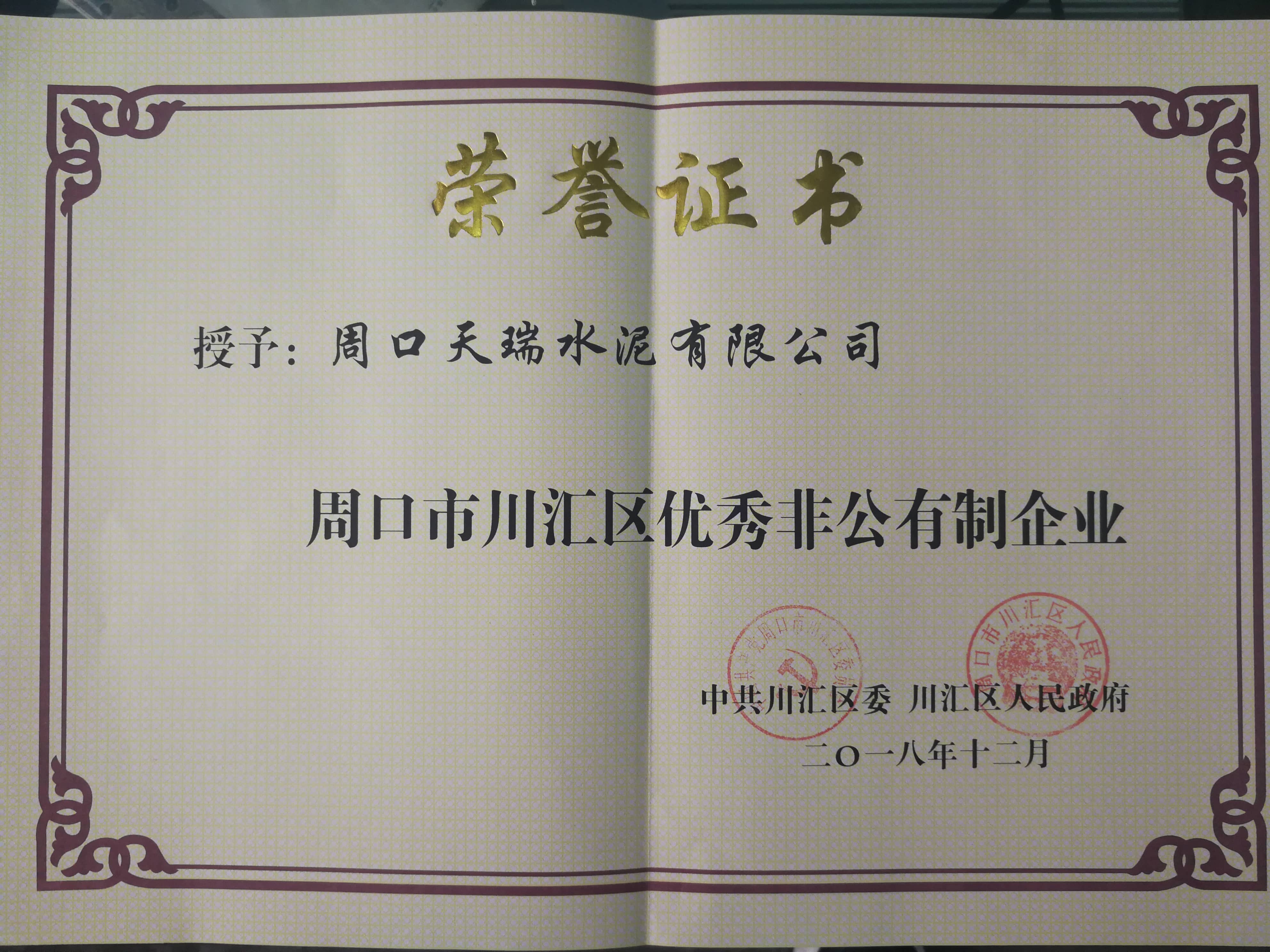 12月21日,在周口市川匯區區委、區政府召開的“促進非公有制經濟健康發展表彰大會”上,天瑞周口水泥公司被區委、區政府授予“周口市川匯區優秀非公有制企業”榮譽稱號。