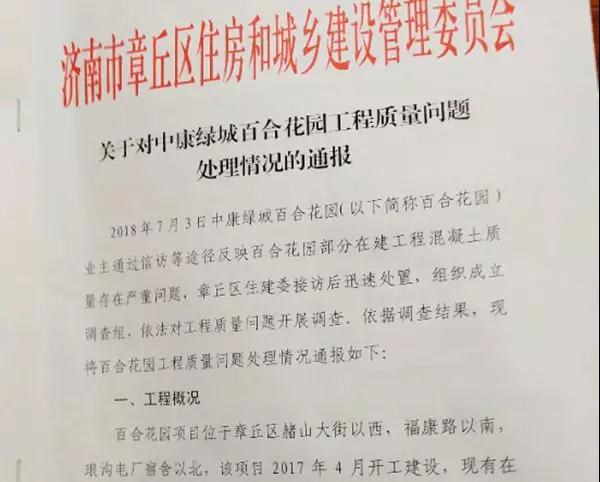 這位負責人向記者出示了濟南市章丘區住房和城鄉建設管理委員會《關于對中康綠城百合花園工程質量問題處理情況的通報》。