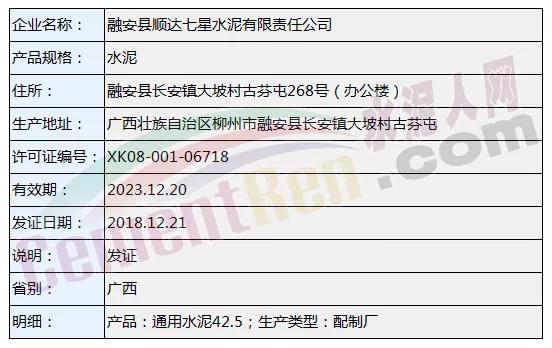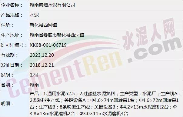 日前,質檢總局全國工業產品生產許可證辦公室發放12月份第二批31個編號水泥企業生產許可證,其中包括兩個編號新發證書,分別為湖南海螺水泥有限公司和融安縣順達七星水泥有限責任公司,其中融安縣順達七星水泥有限責任公司生產類型為水泥配置廠;