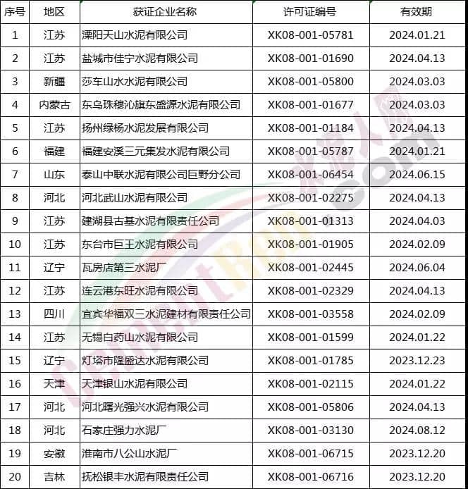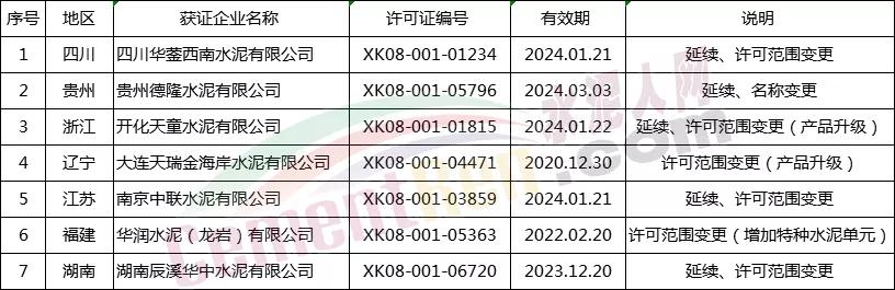 到期延續證書20個編號,涉及華潤水泥 、山水水泥、中聯水泥、天山水泥等企業集團子公司;名稱變更、許可范圍變更的共7個編號,其中包括四川華鎣西南水泥、南京中聯水泥、華潤水泥龍巖公司等公司;