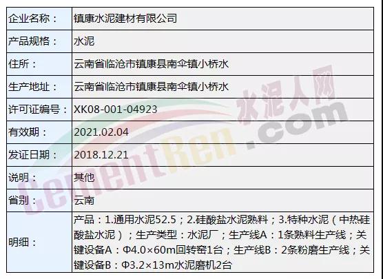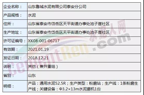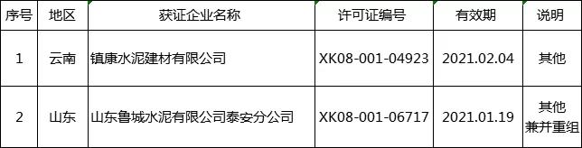 涉及其他項目核發生產許可證的共2家企業2個編號生產許可證。分別為山東魯城水泥有限公司泰安分公司和云南省鎮康水泥建材有限公司。詳情如下: