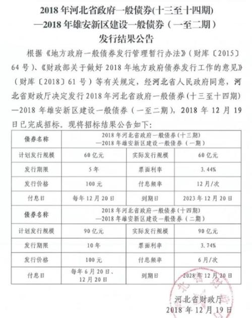 此前,河北省財政廳發行的2018年河北省政府一般債券(十三至十四期)、2018年雄安新區建設一般債券(一至二期)已于12月19日完成招標。