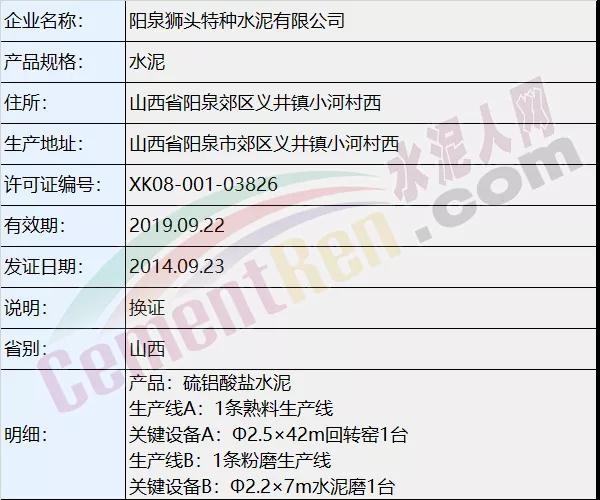 質檢總局生產許可證辦公室數據顯示陽泉獅頭特種水泥有限公司主要以生產鋁酸鹽水泥系列為主,為窯磨一體全能企業,熟料生產線關鍵設備為Φ2.5×42m回轉窯1臺;水泥粉磨生產線關鍵設備為Φ2.2×7m水泥磨1臺。