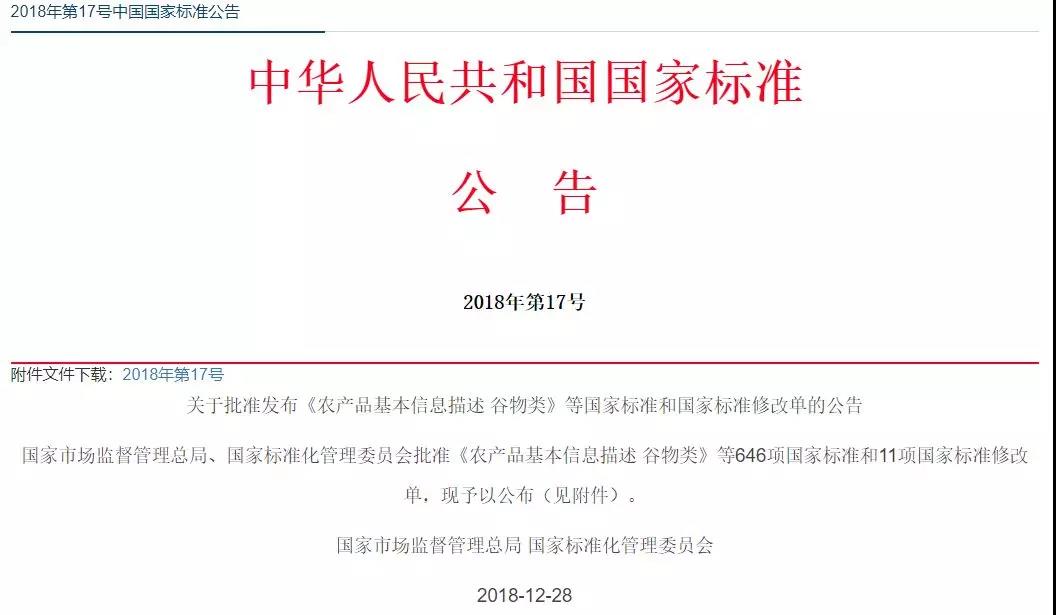 日前,國家標準委發布關于批準發布《農產品基本信息描述 谷物類》等國家標準和國家標準修改單的公告即2018年第17號中國國家標準公告。公告稱,國家市場監督管理總局、國家標準化管理委員會批準《農產品基本信息描述 谷物類》等646項國家標準和11項國家標準修改單,并予以公布。