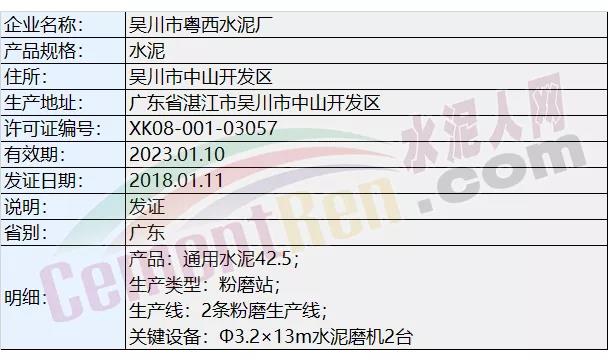 國(guó)家質(zhì)檢總局生產(chǎn)許可證辦公室數(shù)據(jù)顯示吳川市粵西水泥廠生產(chǎn)類(lèi)型為水泥粉磨站,其產(chǎn)品為通用水泥42.5;擁2條粉磨生產(chǎn)線Φ3.2×13m水泥磨機(jī)2臺(tái)。發(fā)證日期為2018年1月11日。