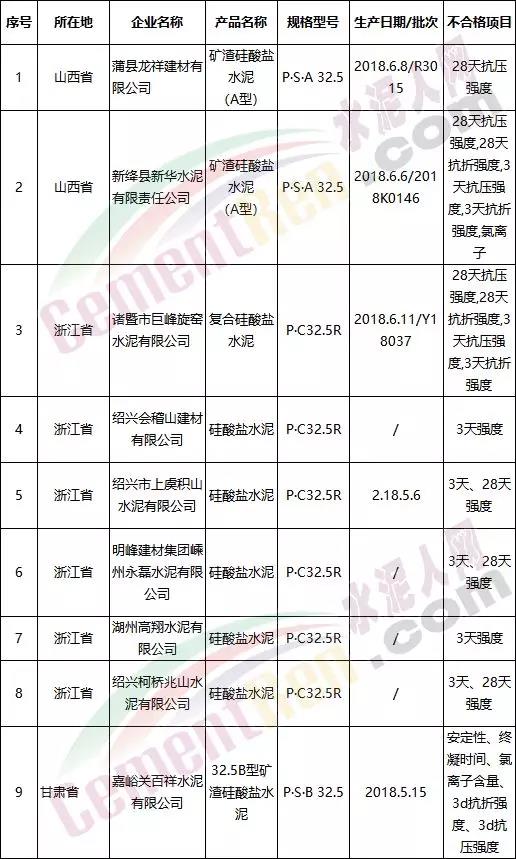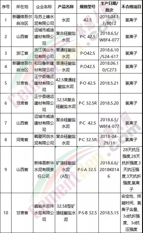 2018年水泥氯離子不合格企業名單