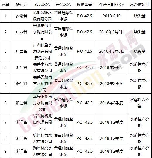 2018年二季度浙江省針對水泥產品的抽檢發現部分產品的水溶性六價鉻項目不合格。包括六家企業的產品。而廣西和安徽省的部分企業被查到燒失量項目不達標。