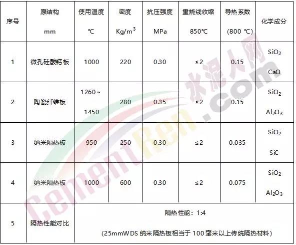 納米隔熱材料是采用納米技術,添加了獨特的反紅外輻射材料,采取特殊的工藝生產出來的納米級微孔隔熱材料,相比較于傳統陶瓷纖維和微孔硅酸鈣板這類微米級氣孔隔熱材料,納米隔熱材料的氣孔在20納米左右,這是導致其導熱系數成為迄今為止最低的隔熱材料,同樣溫度下的隔熱性能比傳統要好4倍,詳細的性能對比見表—1。