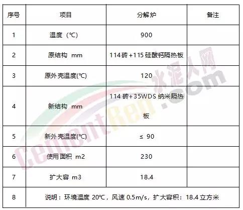 中材魯南中聯水泥公司采用WDS納米隔熱材料,代替原有的115硅酸鈣板,擴大分解爐的內部容積,原來的耐火結構是114mm耐火磚和115mm硅酸鈣板,為了擴大內徑,原耐火磚114mm不變,采用35的WDS納米隔熱板代替原來的硅酸鈣板,詳細情況見表—2。