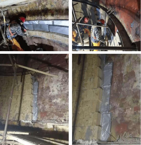 在分解爐內部鋼殼上,將25mm950型納米 隔熱板緊貼鋼殼,然后施工10mm1050型的納米隔熱板(兩層錯縫施工)。有澆注料的地方,由于有錨固件,可以將是兩層隔熱板合并在一起制作成條狀,1050型納米隔熱板在熱面,條板寬度和錨固件間距等寬,采用一般的耐火膠泥固定施工即可,施工的要領基本上同硅酸鈣板。不同之處是,納米隔熱板不能讓水進入,所以,施工中要保留外面的防水塑料保護層。