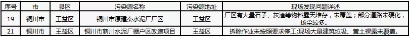 日前,陜西省生態環境廳公布的重污染天氣違法案例(1月6日)顯示,銅川市原建秦水泥廠廠區有大量石子、灰渣等物料露天堆存,未覆蓋;部分道路未硬化,揚塵較多、銅川市新川水泥廠棚戶區改造項目拆除作業未按照要求停工;現場大量建筑垃圾、黃土裸露未覆蓋。公示內容如下:
