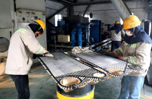 高鎖利是制成車間一名普通的潤滑工,卻有著高超的“御油之術”,從日常潤滑管理、降低磨輥溫度再到磨機油站改造,他都是行家里手,從不懼怕困難,解決著一個又一個難題。此次檢修,他考慮到板式冷卻器長時間運作,容易造成堵塞,制冷效果必打折扣的問題。于是,他緊抓檢修時間,組織檢修人員分工協作,近60多片的冷卻板經過鹽酸、汽油的洗禮后,均已全部煥然一新,時刻準備著再戰“沙場”。作為設備潤滑工,身上難免沾有油污,他總是淡然地說道:“我臟了不怕,只要設備干凈了,能正常運轉就行,值了!”