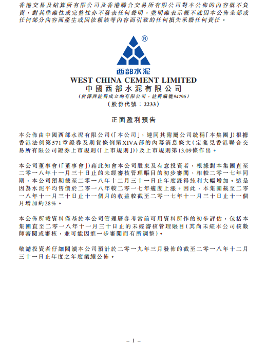 西部水泥預料截至去年12月底止年度純利大幅增加,主要由于水泥平均售價適度上漲,帶動去年首11個月收益按年增加28%。