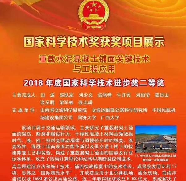 1月8日上午,在北京召開的國家科學技術獎勵大會上,宣布了《國務院關于2018年度國家科學技術獎勵的決定》。山西省共有3項科研成果獲得國家科學技術進步獎(通用項目)二等獎,其中山西省主持完成的1項,參與完成的2項。山西交控集團旗下山西省交通科學研究院主持完成的“重載水泥混凝土鋪面關鍵技術與工程應用”項目榮獲國家科學技術進步二等獎,是山西這次唯一主持完成的獲獎項目。