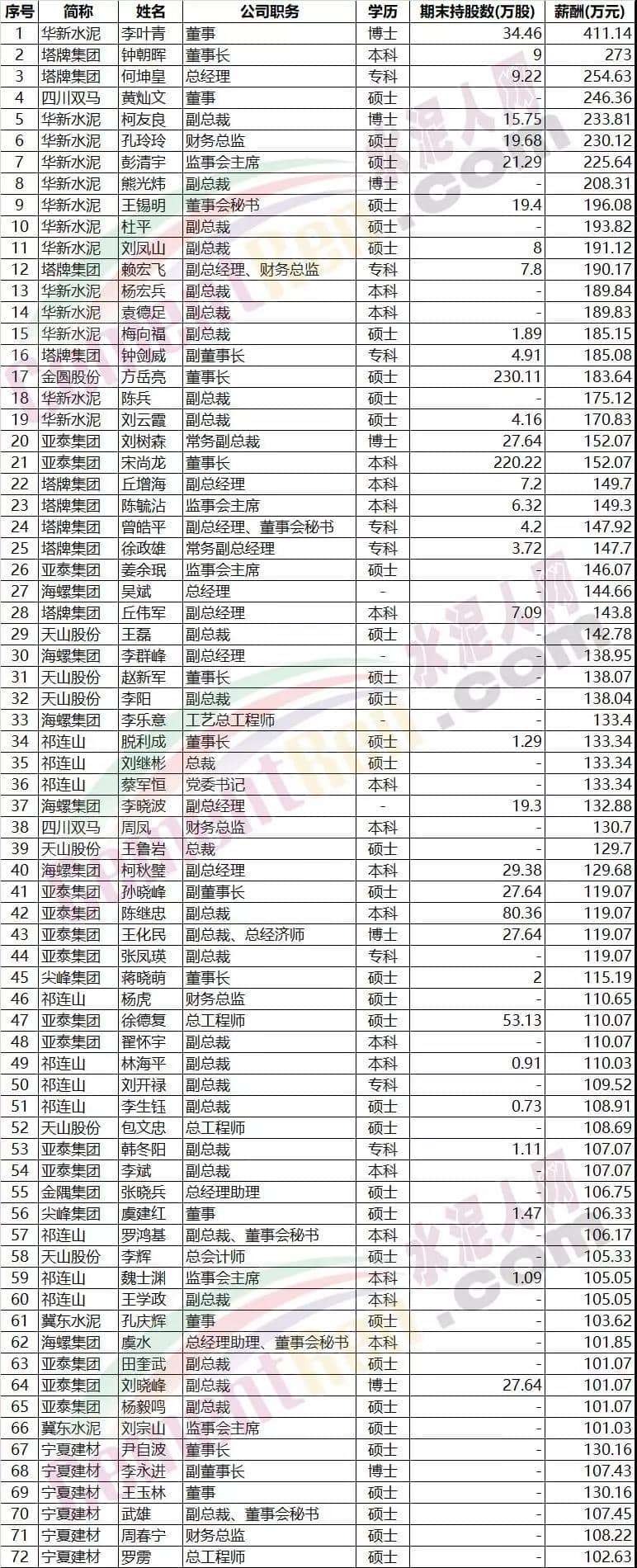 據(jù)水泥人網(wǎng)通訊員反饋,水泥行業(yè)企業(yè)在每年年初都會依據(jù)上年業(yè)績制定出相應的任務計劃,企業(yè)高管完成或超額完成年度計劃的,將也會獲得一筆不菲的獎金,金額從幾十萬到幾百萬元不等,所以水泥行業(yè)各位高管或將拿到歷史上“最高”年薪。