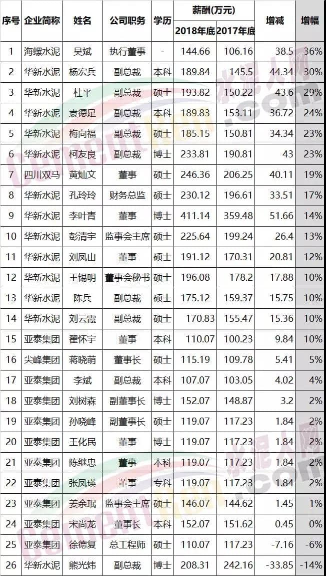 從上表可見,近兩年來年薪增幅最高的是海螺集團總經(jīng)理吳斌,增幅達36%,上表中26位上市企業(yè)高管中有15位年薪漲幅達到10%以上。