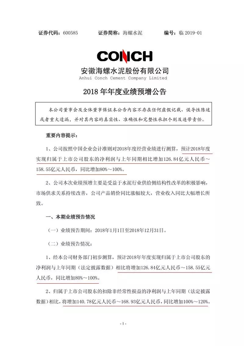 公司表示,做出上述預測,是基于以下原因:報告期內,受益于水泥行業供給側結構性改革的積極影響,市場供求關系持續改善,公司產品銷價同比漲幅較大,營業收入同比大幅增長,使本公司歸屬于上市公司股東的凈利潤同比大幅上升。