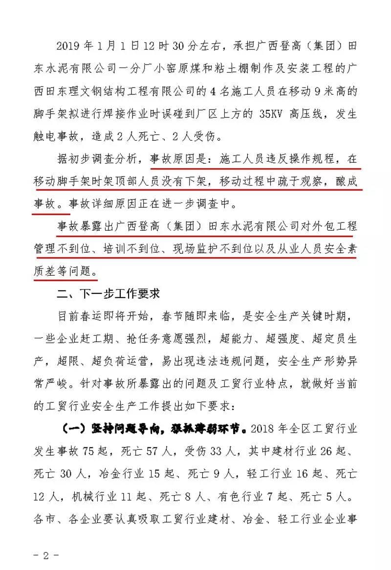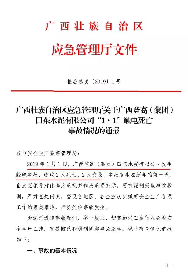 附:廣西壯族自治區應急管理廳關于廣西登高(集團)田東水泥有限公司“1_1”觸電死亡事故情況的通報