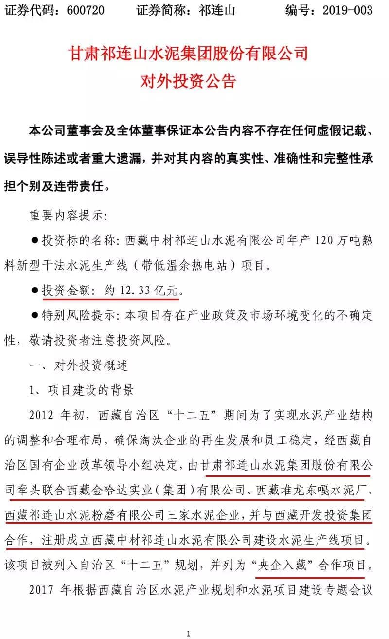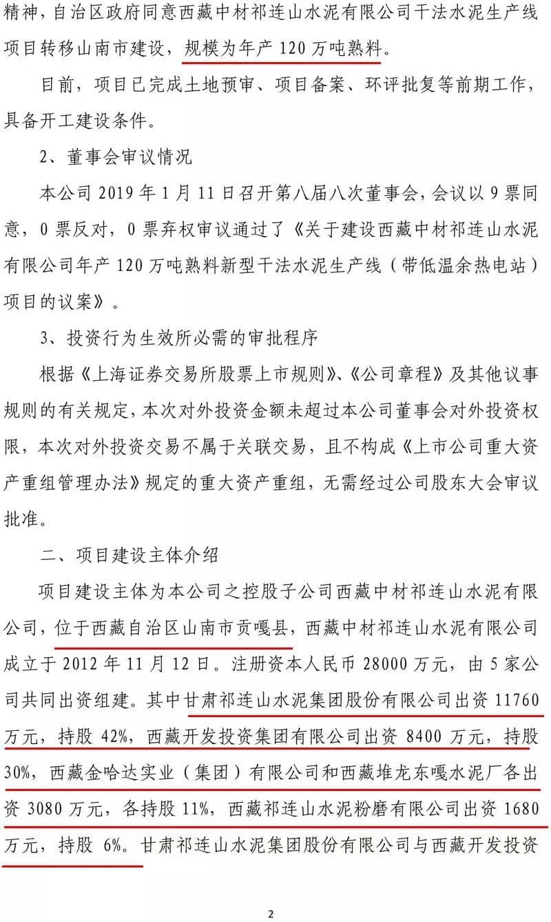 該項(xiàng)目建設(shè)主體西藏中材祁連山水泥,位于西藏自治區(qū)山南市貢嘎縣,西藏中材祁連山水泥成立于2012年,注冊(cè)資本人民幣2.8億元,由 5 家公司共同出資組建。