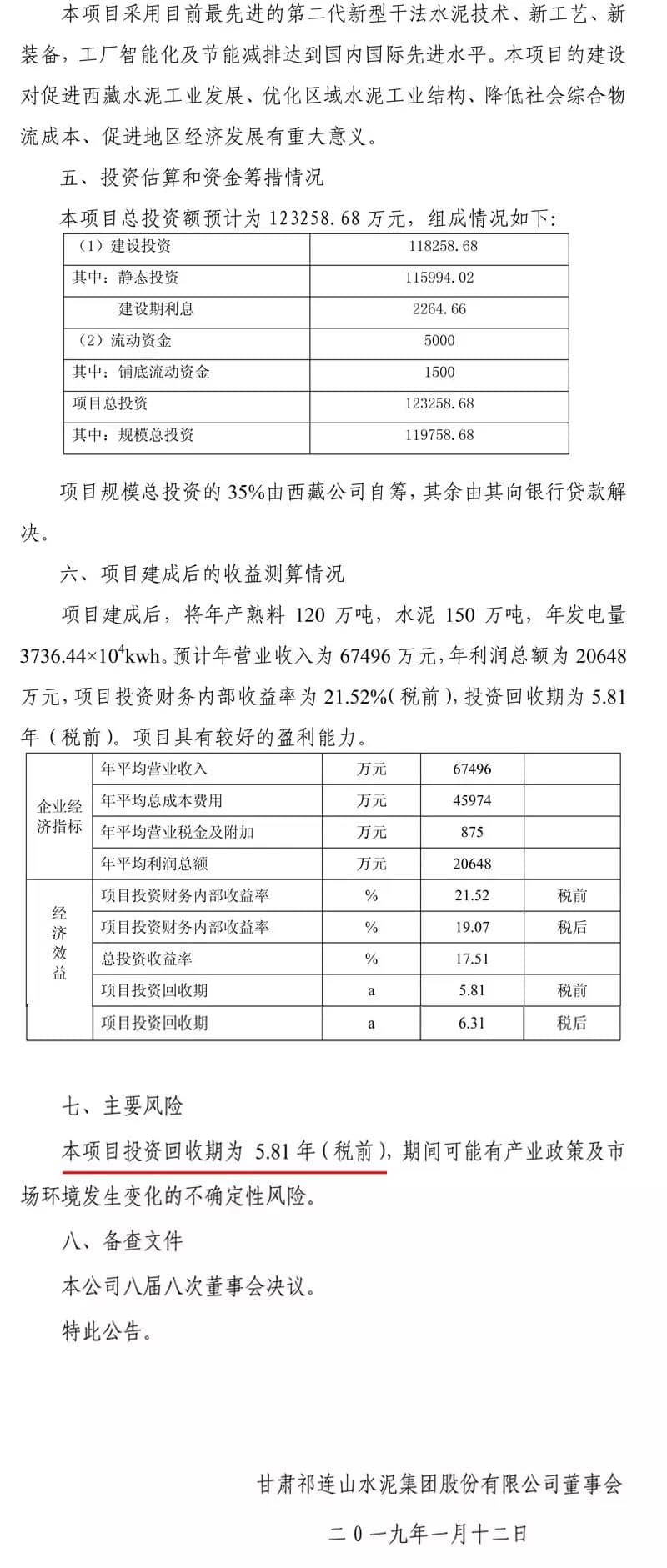 項(xiàng)目建成后,將年產(chǎn)熟料120萬(wàn)噸,水泥150萬(wàn)噸,年發(fā)電量3736.44×104kwh。預(yù)計(jì)年?duì)I業(yè)收入為6.75億元,年利潤(rùn)總額為2.06億元,項(xiàng)目投資財(cái)務(wù)內(nèi)部收益率為21.52%(稅前),投資回收期為5.81年(稅前),具有較好的盈利能力。公告原文如下: