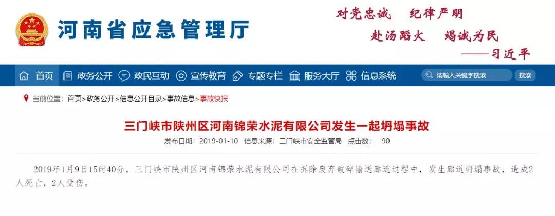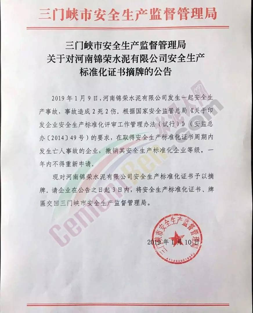 2019年1月11日河南省三門峽市安全生產(chǎn)監(jiān)督管理局發(fā)布《關(guān)于對河南錦榮水泥有限公司安全生產(chǎn)標(biāo)準(zhǔn)化證書摘牌的公告》。公告稱,2019年1月9日,河南錦榮水泥有限公司發(fā)生一起安全生產(chǎn)事故,事故造成2死2傷,根據(jù)國家安全監(jiān)管總局《關(guān)于印發(fā)企業(yè)安全生產(chǎn)標(biāo)準(zhǔn)化評審工作管理辦法(試行)》(安監(jiān)總辦【2014】49號)的要求,在取得安全生產(chǎn)標(biāo)準(zhǔn)化證書周期內(nèi)發(fā)生亡人事故的企業(yè),撤銷其安全生產(chǎn)標(biāo)準(zhǔn)化企業(yè)等級,一年內(nèi)不得重新申請。