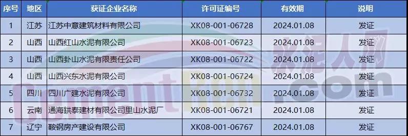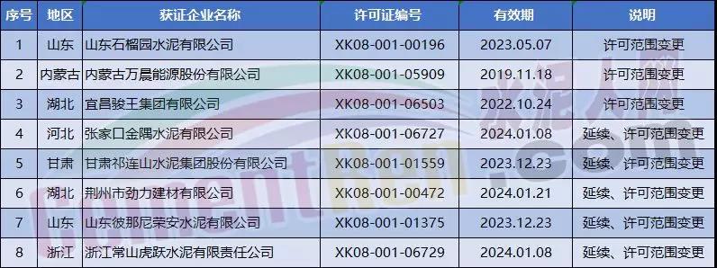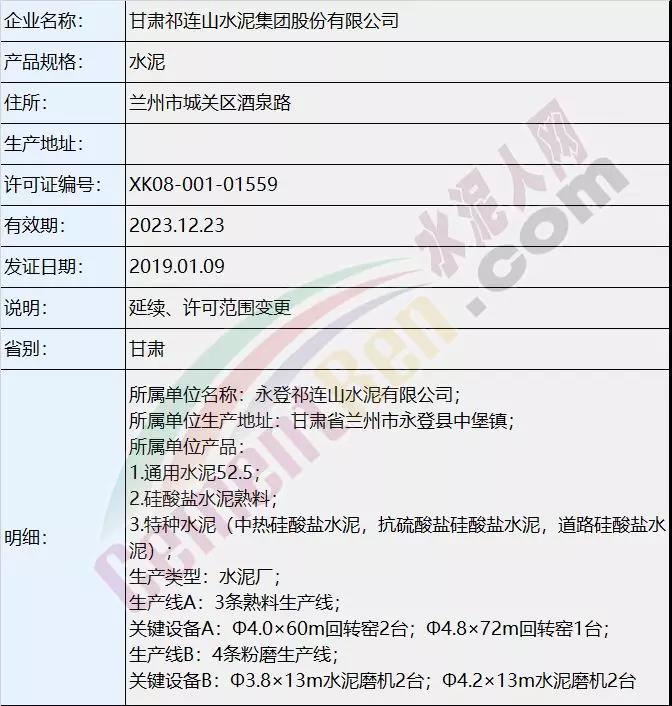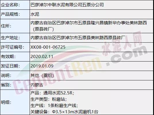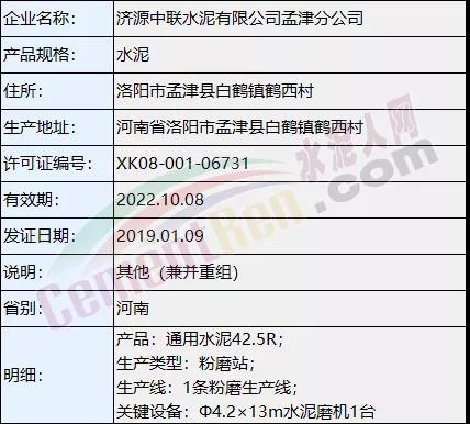 水泥人網消息,2019年1月9日,國家質檢總局生產許可證辦公室發放2019年第一批水泥企業生產許可證,共18家企業。其中新發證書7家企業,許可范圍變更 3家企業,延續及許可范圍變更5家企業,其他兼并重組或重組3家企業。涉及企業金隅水泥、祁連山水泥、中聯水泥等水泥集團公司下屬企業。其中濟源中聯、臨城中聯、巴彥卓爾中聯水泥均涉及重組相關。詳情如下: