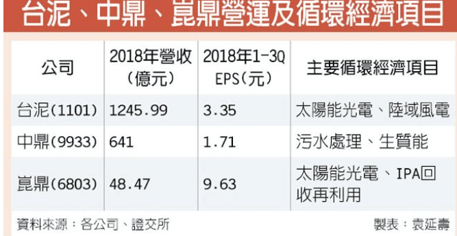 循環經濟正夯,也是市場趨勢,臺泥(1101)、中鼎(9933)、崑鼎(6803)近2年投資的環保、綠能產業場域,2019年將可陸續收成;市場預估,今年這些企業在循環經濟的產值會比去年翻倍。