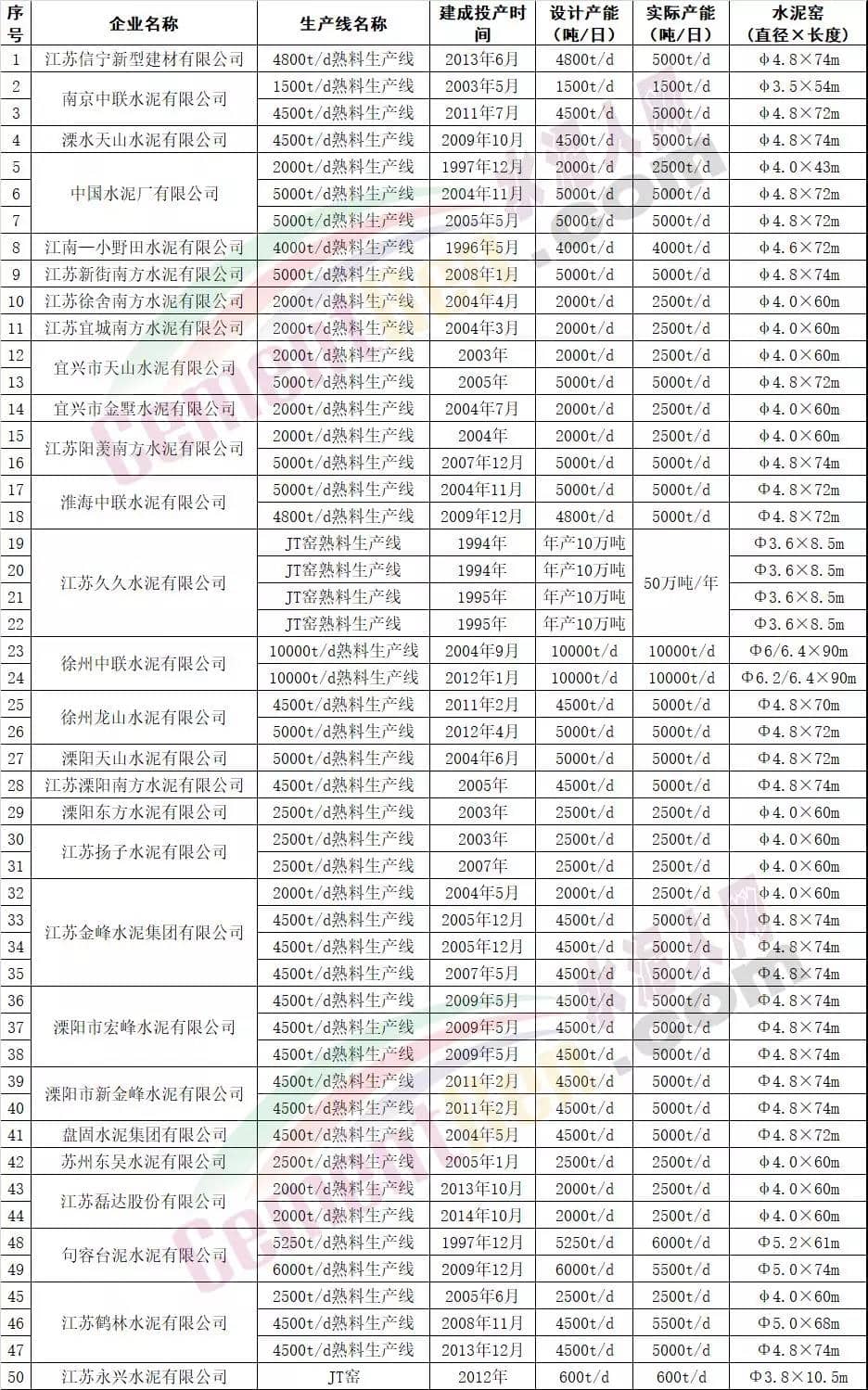 備注:上述數據來源于水泥人網信息中心數據庫,截止2017年12月31日位于江蘇省鎮江市潤州區韋崗街道的江蘇聯合水泥有限公司的6000t/d熟料生產線(Φ5.2×61m水泥窯)已按100萬噸/年產能公告,用于產能置換 。