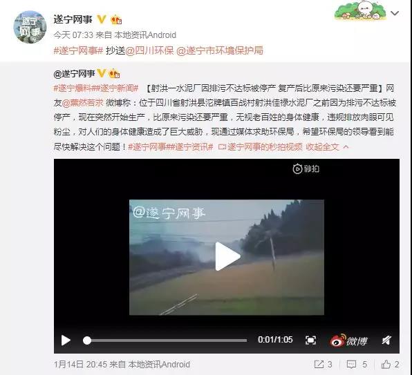 據微博網友@薰然若澩 微博稱:位于四川省射洪縣沱牌鎮百戰村射洪佳祿水泥廠之前因為排污不達標被停產,現在突然又重新開始生產,而污染比原來更加嚴重,完全無視老百姓的身體健康,違規排放肉眼可見粉塵,對人們的身體健康造成了巨大威脅,現通過媒體求助環保局,希望環保局的領導看到能盡快解決這個問題!