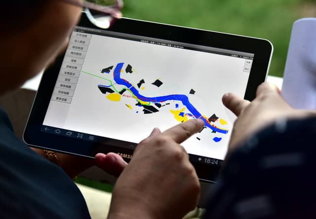 2017年9月7日,原環境保護部組織的長江經濟帶飲用水水源地環境保護執法專項行動第一督查組在湖北武漢督查。圖為督查人員通過飲用水水源保護區現場巡查衛星遙感支持系統在現場檢查。攝影/章軻