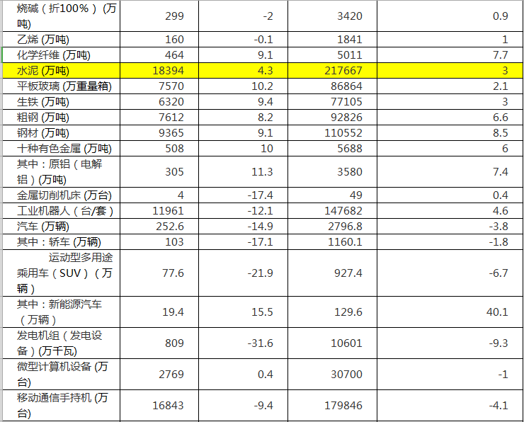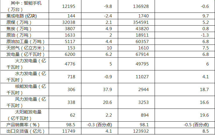 分產(chǎn)品看,12月份,596種產(chǎn)品中有330種產(chǎn)品同比增長。其中,鋼材9365萬噸,同比增長9.1%;水泥18394萬噸,增長4.3%;十種有色金屬508萬噸,增長10.0%;乙烯160萬噸,下降0.1%;汽車252.6萬輛,下降14.9%,其中,轎車103.0萬輛,下降17.1%;發(fā)電量6200億千瓦時,增長6.2%;原油加工量5117萬噸,增長4.4%。