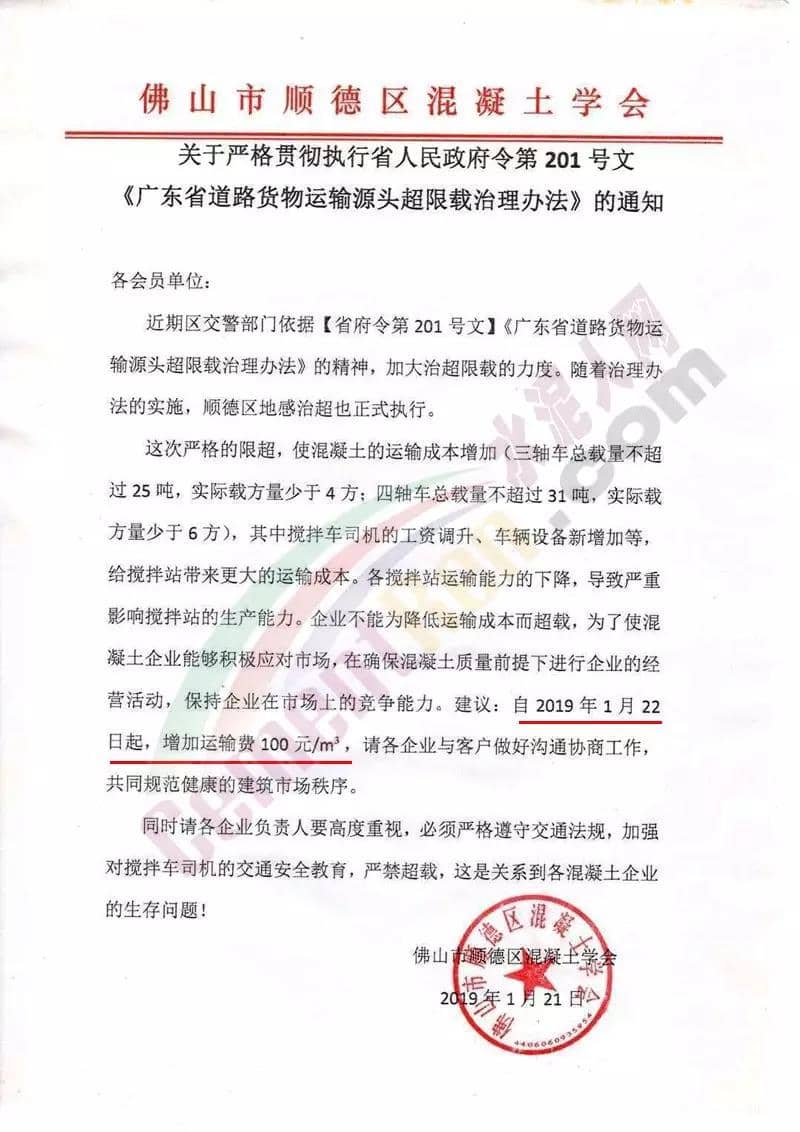 建議:自2019年1月22日起,增加運(yùn)輸費(fèi)100元/立方,請(qǐng)各企業(yè)與客戶(hù)做好溝通協(xié)調(diào)工作,工同規(guī)范健康的建筑市場(chǎng)秩序。