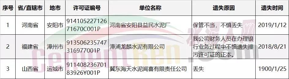 另有3家水泥企業排污許可證遺失,分別為河南省安陽縣益民水泥廠排污許可證因保管不當,不慎丟失;漳浦龍麟水泥有限公司財務人員在辦理銀行業務過程中不慎遺失排污許可證的正本;冀東海天水泥聞喜有限責任公司排污許可證丟失。