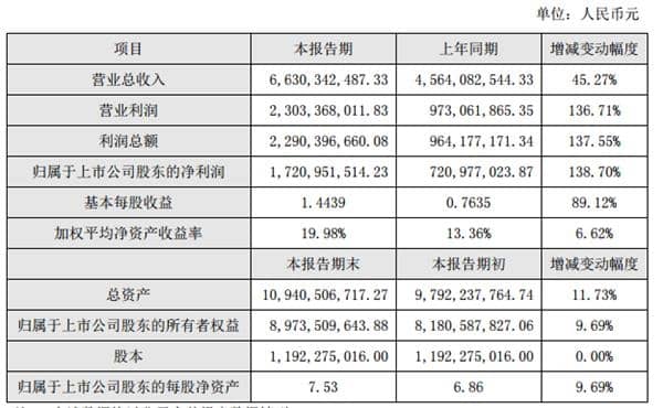 公司水泥銷售價格較上年同期上升了26.52%,受原材料價格上漲的影響,水泥銷售成本同比上升了6.13%,水泥銷售價格的上漲高于成本的上升使得綜合毛利率提高了10.78個百分點。受此疊加影響,報告期公司營業(yè)利潤、利潤總額和歸屬于上市公司股東的凈利潤實現(xiàn)了大幅度的增長,并使得報告期加權(quán)平均凈資產(chǎn)收益率同比上升了6.62個百分點。