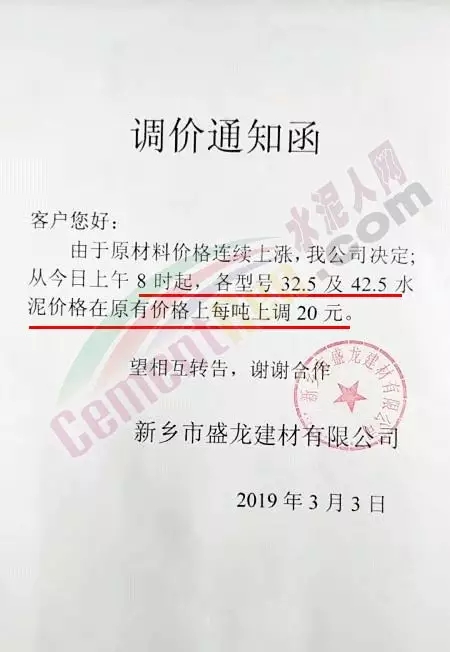 3月3日,新鄉(xiāng)市盛龍建材有限公司發(fā)布調(diào)價(jià)通知函,稱由于原材料價(jià)格連續(xù)上漲,公司決定自3月3日上午8時(shí)起,各型號(hào)32.5及42.5水泥價(jià)格在原有價(jià)格上每噸上調(diào)20元。