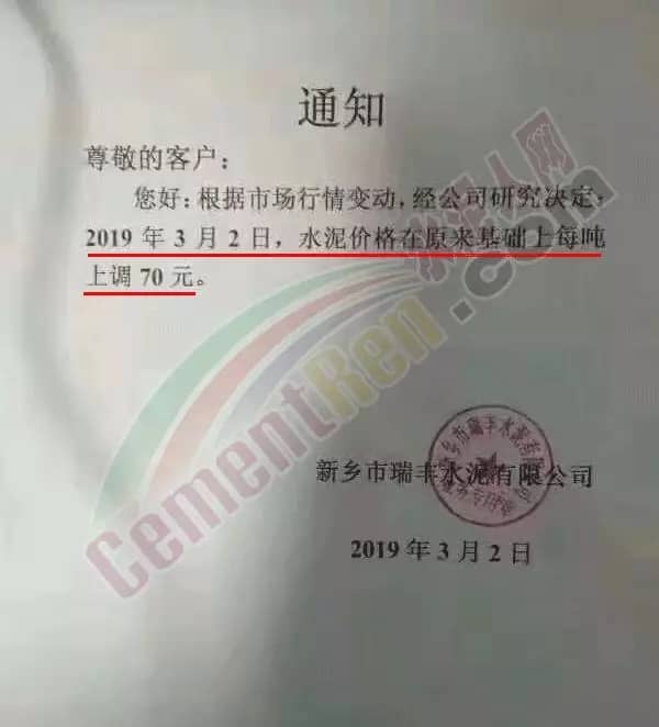 日前,河南省多家水泥企業(yè)發(fā)布調(diào)價(jià)通知: