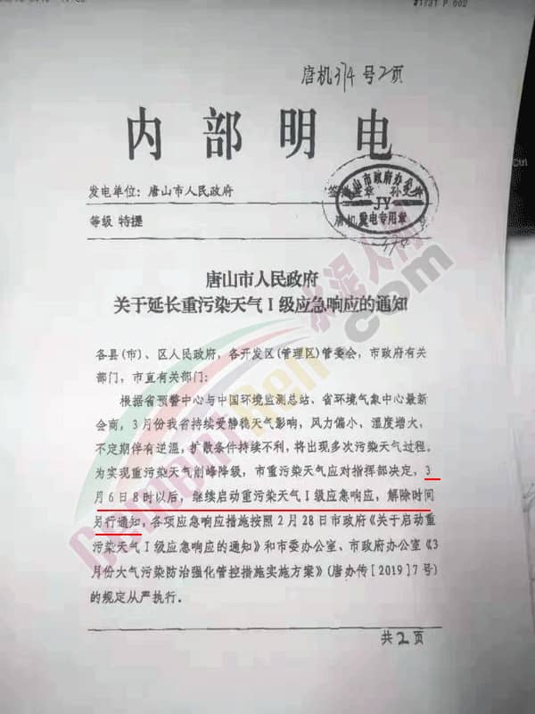唐山市人民政府發布內部明電《關于延長重污染天氣I級應急響應的通知》,通知唐山市區域今日(3月6日)8時以后,繼續啟動重污染天氣I級應急響應,解除時間另行通知 ,各項應急響應措施按照2月28日市政府《關于啟動重污染天氣I級響應的通知 》和市委,市政府相關規定從嚴執行。通知原文如下: