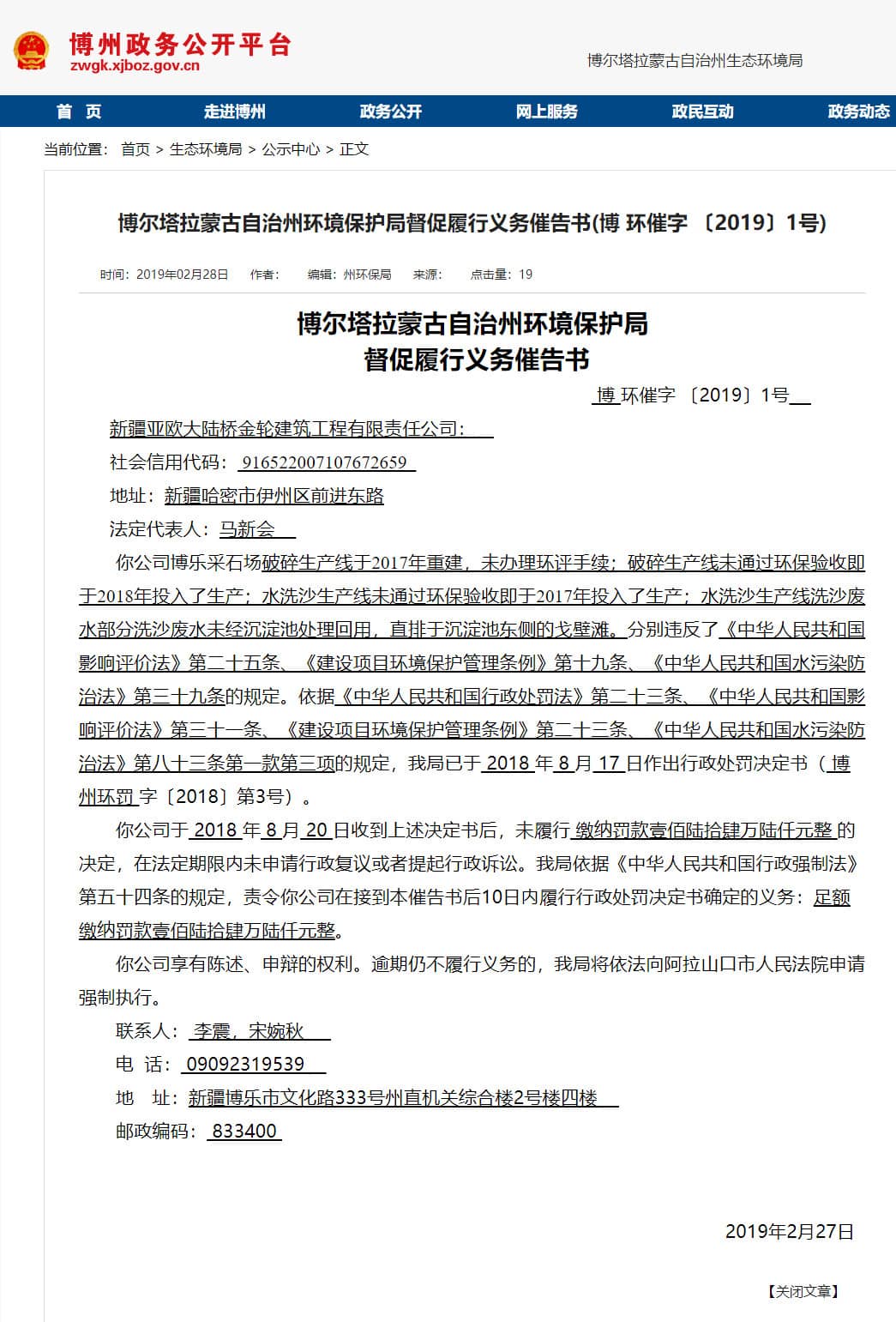 日前,新疆維吾爾自治區博爾塔拉蒙古自治州環境保護局發布《博爾塔拉蒙古自治州環境保護局督促履行義務催告書》,對新疆亞歐大陸橋金輪建筑工程有限責任公司博樂采石場進行罰款1646000元,因該企業破碎生產線重建未辦理環評手續,投產未通過環保驗收,水洗砂投產未通過環保驗收,部分洗砂廢水直排于沉淀池東側的戈壁灘。