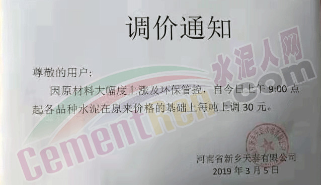 3月5日河南省新鄉天泰有限公司發布調價通知稱,因原材料大幅度上漲及環保管控,自3月5日上午9:00起各品種水泥在原價格基礎上每噸上調30元/噸。