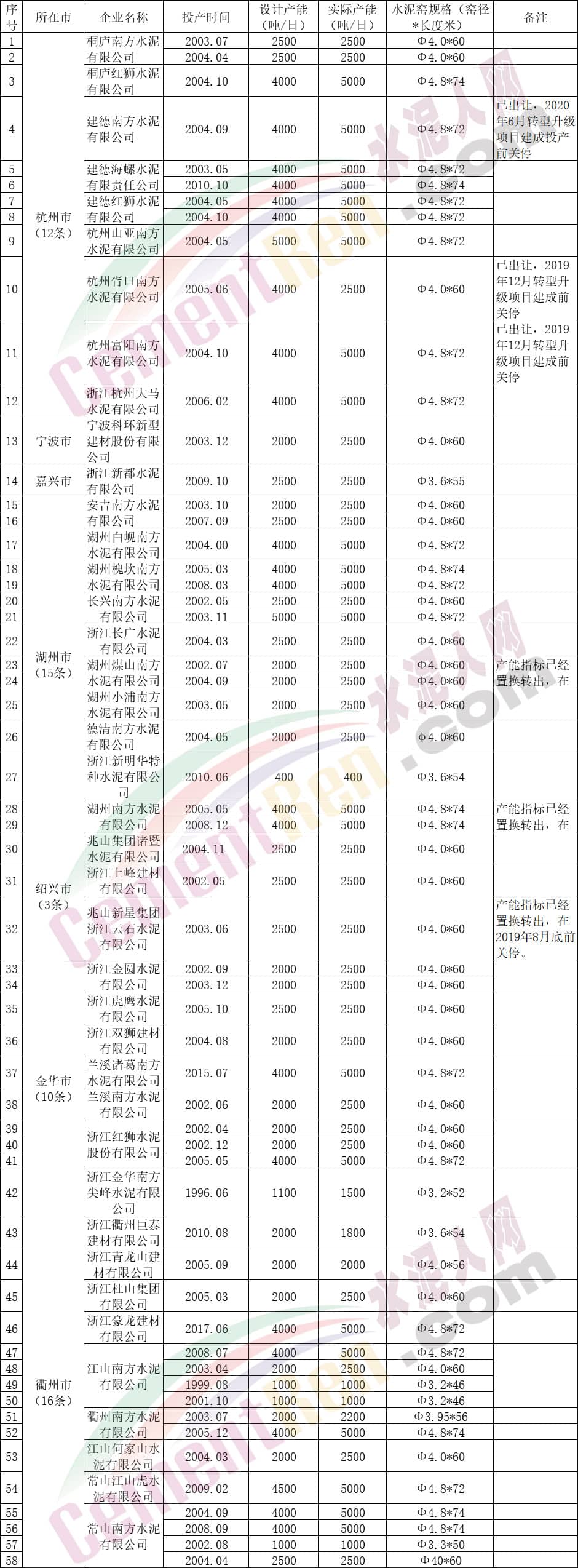 另外,2010年10月投產的建德海螺水泥有限責任公司、2015年7月投產的蘭溪諸葛南方水泥有限公司以及2017年6月投產的浙江豪龍建材有限公司三條熟料生產線均為設計產能4000t/d,實際產能5000t/d。