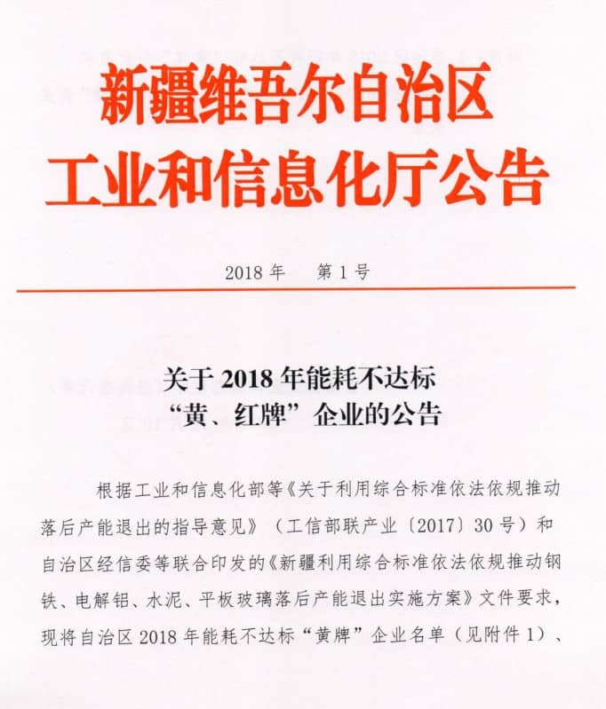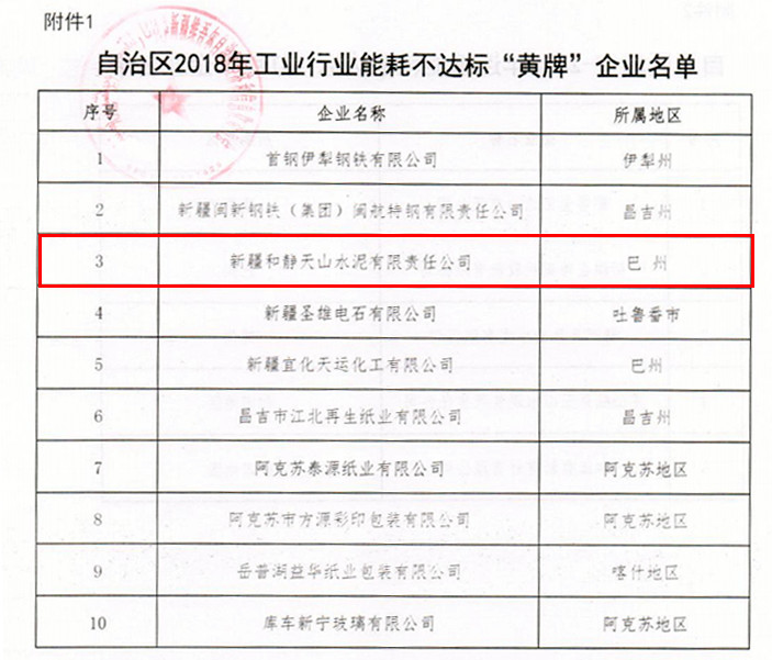 據水泥人網了解,在2018年12月,新疆維吾爾自治區工信廳發布了《關于2018年能耗不達標“黃、紅牌”企業的公告》,公告中提到新疆和靜天山水泥有限責任公司被列為新疆2018年工業行業能耗不達標“黃牌”企業。