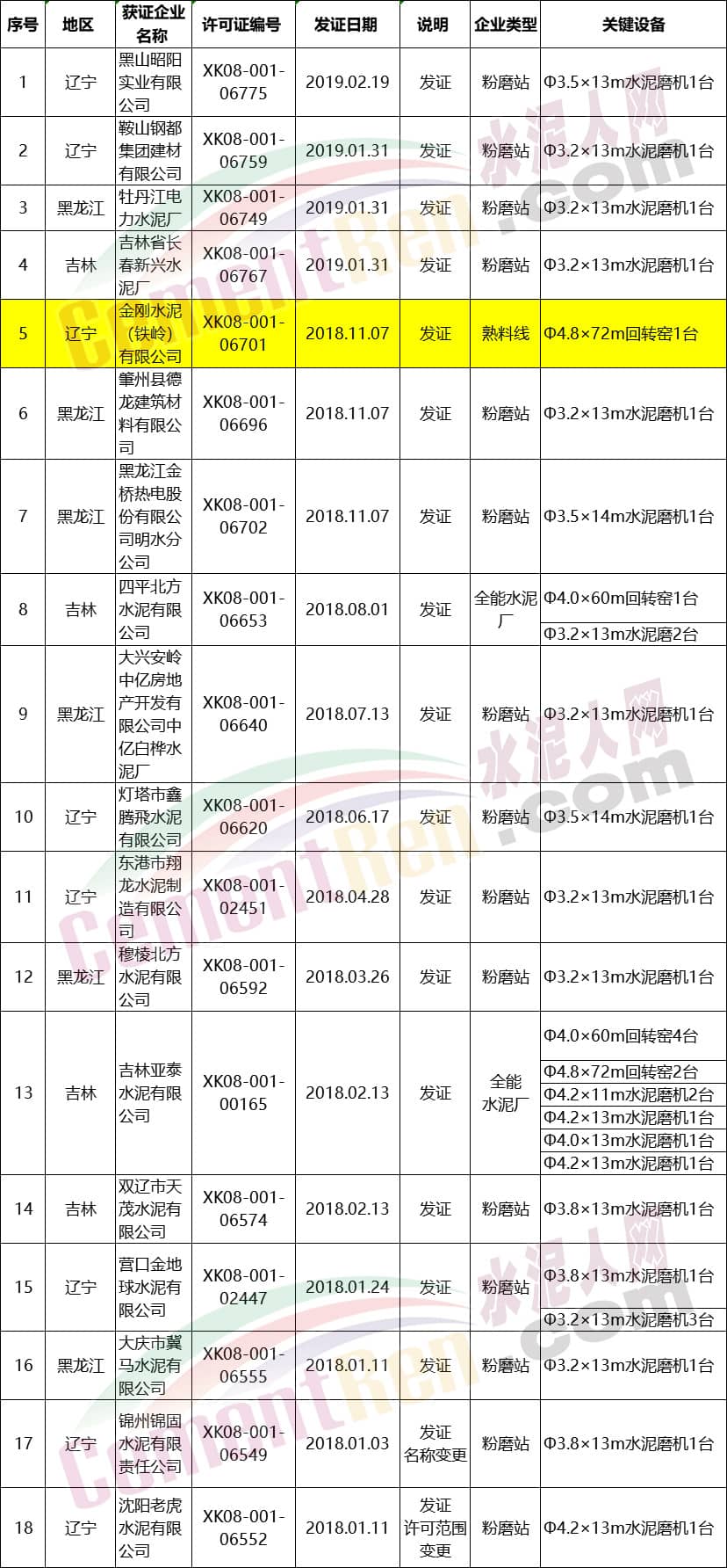據(jù)查詢,遼寧,吉林,黑龍江從2018年1月至今一共新領(lǐng)生產(chǎn)許可證18個(gè)編號(hào)。其中除吉林亞泰水泥有限公司外和金剛水泥(鐵嶺)有限公司關(guān)鍵設(shè)備包含回轉(zhuǎn)窯設(shè)備,其余全部為水泥磨機(jī)。按照2018年1月1日起開始施行的《水泥玻璃行業(yè)產(chǎn)能置換實(shí)施辦法》計(jì)算金剛水泥(鐵嶺)有限公司Φ4.8×72m回轉(zhuǎn)窯設(shè)計(jì)產(chǎn)能為5000t/d熟料生產(chǎn)線。