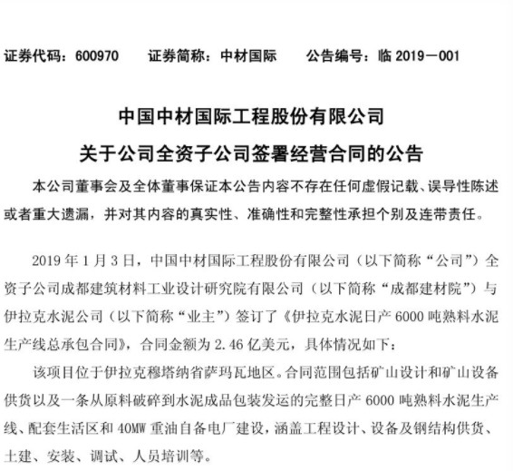2019年1月3日,中國中材國際工程股份有限公司(以下簡稱“公司”)全資子公司成都建筑材料工業設計研究院有限公司(以下簡稱“成都建材院”)與伊拉克水泥公司(以下簡稱“業主”)簽訂了《伊拉克水泥日產6000噸熟料水泥生產線總承包合同》,合同金額為2.46億美元。合同約定,合同生效后26個月出熟料,合同生效后37個月達標達產。